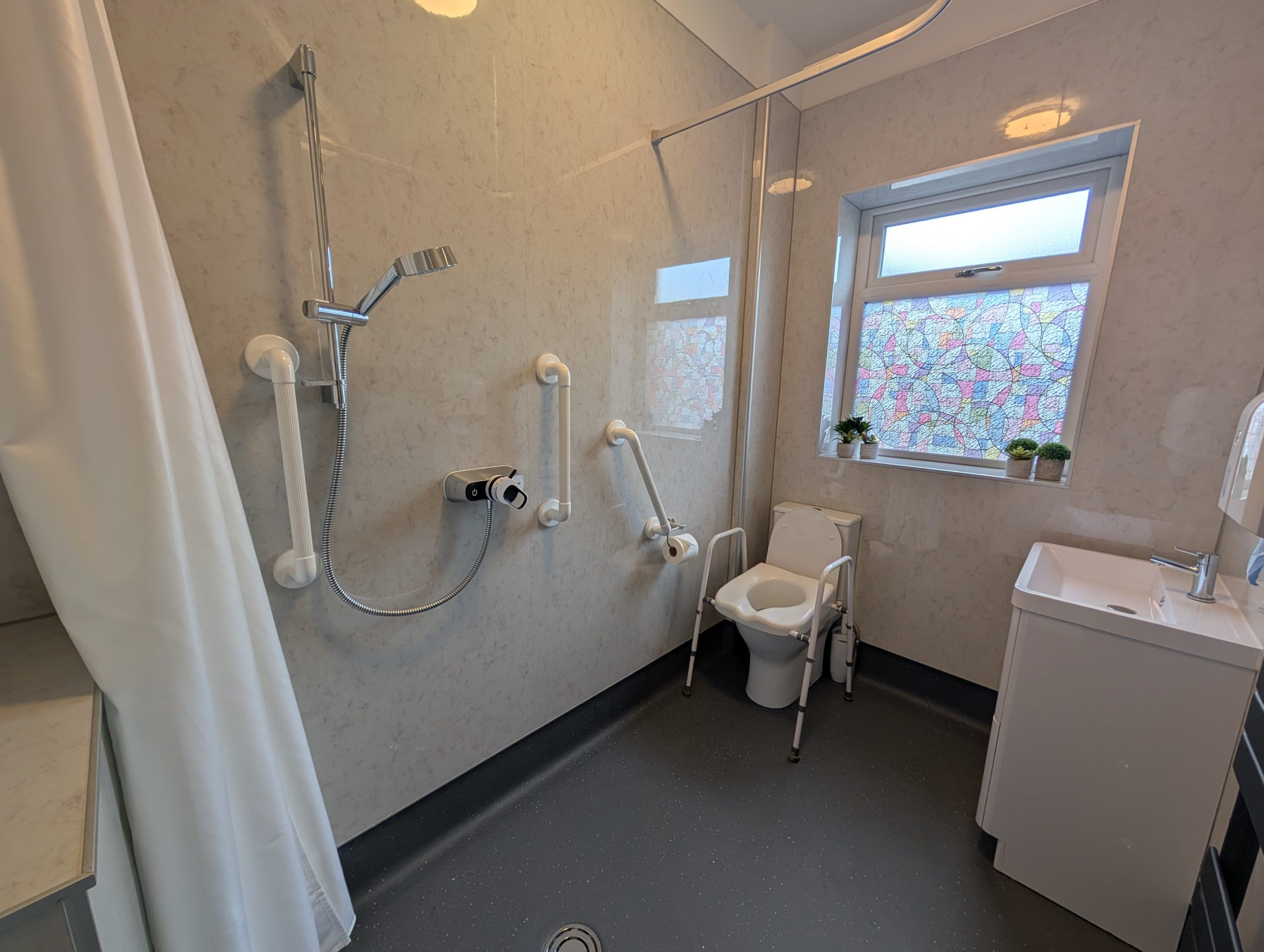 Bathroom facilities on the ground floor include a wet room with shower and toilet, a large modern bathroom with a walk-in shower enclosure and an assisted bath, along with two additional toilets for resident use. Upstairs, there is a large bathroom with a walk-in shower and toilet, as well as a further separate toilet.